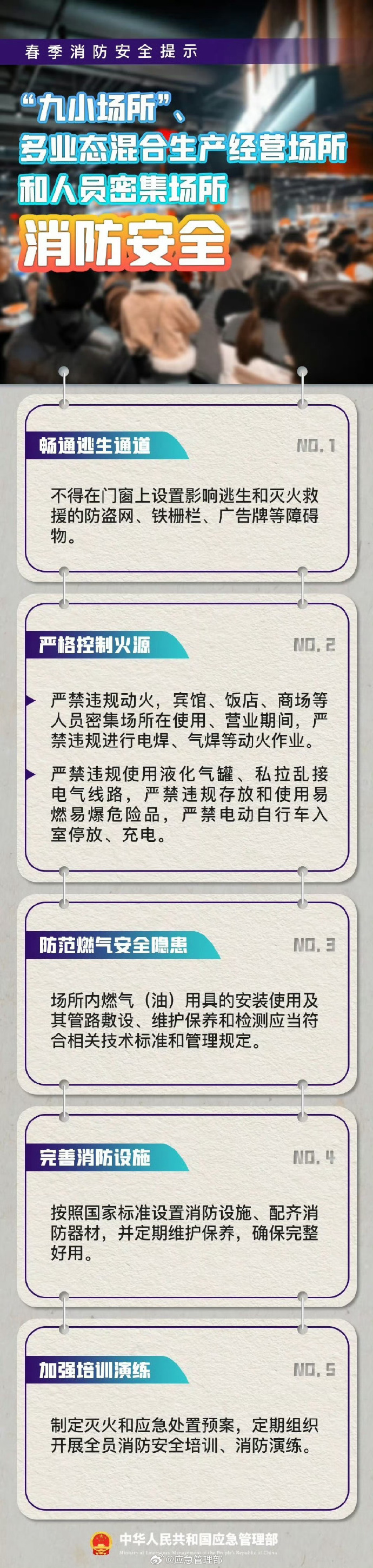 春季天干物燥,大風(fēng)天氣多,一個(gè)小火星就可能引起火災(zāi)。因此,在生活生產(chǎn)中,一定要注意防范安全隱患。 “九小場(chǎng)所”、多業(yè)態(tài)混合生產(chǎn)經(jīng)營(yíng)場(chǎng)所、人員密集場(chǎng)所等要注意哪些事項(xiàng)?