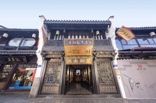以朱炳仁團(tuán)隊(duì)打造的銅屋系列為例:入駐亳都·新象的“中原銅屋”是其全國第四家、華中第一家銅屋。建筑內(nèi)部以超高、超寬的銅板工藝打造出“銅盒子”視覺焦點(diǎn),磚木結(jié)構(gòu)搭配著銅與玻璃的碰撞,產(chǎn)生時(shí)空交錯(cuò)的美感。“中原銅屋”整體風(fēng)格和中原民居相適配,當(dāng)訪客的指尖掠過帶有紋飾的銅器,恰似完成一場(chǎng)跨越三千年的文明對(duì)話——要知道,商城遺址曾出土過杜嶺方鼎等商代青銅文明的巔峰之作,這份地域文化根脈在此得到了呼應(yīng)。