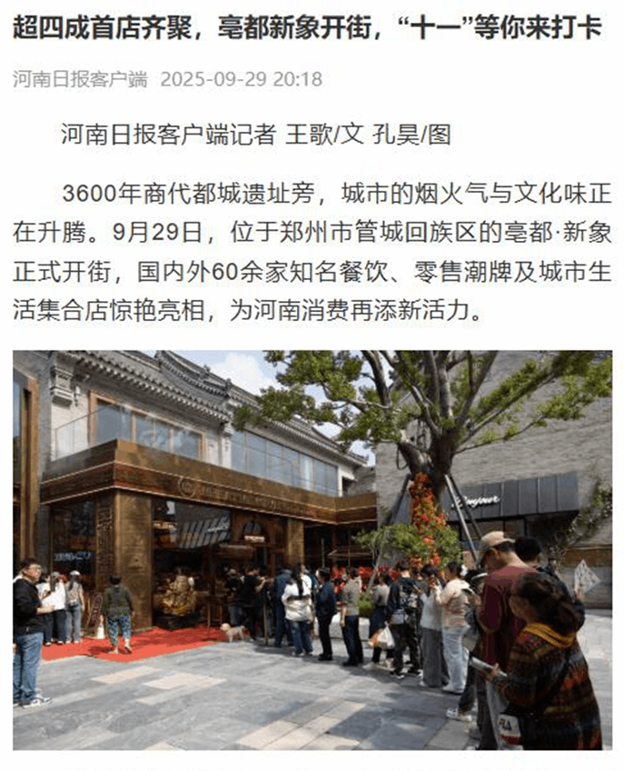 以“傳統(tǒng)風貌現(xiàn)代文化商業(yè)街區(qū)”為定位,該項目深度融合3600年商都文脈與現(xiàn)代商業(yè)活力,以40%的首進品牌占比和精心策劃的文商旅融合體驗,為鄭州打造了一張嶄新的城市文化名片。