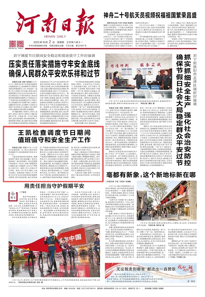 王凱來(lái)到省政府總值班室,視頻連線省氣象局、省交通運(yùn)輸廳、省文化和旅游廳、省自然資源廳、省應(yīng)急管理廳和洛陽(yáng)市、開(kāi)封市,詳細(xì)了解假期首日道路交通、文旅服務(wù)、安全生產(chǎn)等情況,向堅(jiān)守在一線的工作人員致以節(jié)日問(wèn)候。他說(shuō),今年“雙節(jié)”疊加,人流車(chē)流量大,各地各部門(mén)要深入學(xué)習(xí)貫徹習(xí)近平總書(shū)記在河南考察時(shí)重要講話(huà)精神,樹(shù)牢底線思維,強(qiáng)化風(fēng)險(xiǎn)意識(shí),嚴(yán)格落實(shí)值班值守和信息報(bào)送等制度,加強(qiáng)會(huì)商研判和協(xié)調(diào)聯(lián)動(dòng),用辛勤付出為人民群眾創(chuàng)造平安祥和的節(jié)日環(huán)境。要密切關(guān)注天氣變化,提高氣象預(yù)報(bào)預(yù)警精準(zhǔn)度,有效應(yīng)對(duì)持續(xù)降雨天氣,切實(shí)加強(qiáng)山洪地質(zhì)災(zāi)害防范。要扎實(shí)做好交通運(yùn)輸服務(wù)保障,加強(qiáng)高峰時(shí)段、熱點(diǎn)線路運(yùn)力調(diào)配和管控疏導(dǎo),確保群眾安全便捷出行。要更好激發(fā)文旅市場(chǎng)消費(fèi)潛能,持續(xù)豐富業(yè)態(tài),提升服務(wù)質(zhì)量,讓廣大游客乘興而來(lái)、盡興而歸。要嚴(yán)格落實(shí)安全生產(chǎn)責(zé)任制,及時(shí)排查消除?;?、礦山、消防等重點(diǎn)領(lǐng)域風(fēng)險(xiǎn)隱患,加強(qiáng)商超、景區(qū)等人員密集場(chǎng)所安全監(jiān)管,維護(hù)人民群眾生命財(cái)產(chǎn)安全。