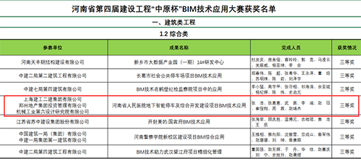 近日,由河南省住建廳指導、河南省建筑業(yè)協(xié)會主辦的河南省第四屆建設(shè)工程“中原杯”BIM技術(shù)應(yīng)用大賽獲獎名單揭曉,經(jīng)過層層評審,由鄭州地產(chǎn)集團投資管理有限公司主導,上海建工二建集團有限公司、機械工業(yè)第六設(shè)計研究院有限公司配合完成申報的河南省人民醫(yī)院地下智能停車及綜合開發(fā)建設(shè)項目BIM技術(shù)應(yīng)用榮獲建筑類綜合成果三等獎。
