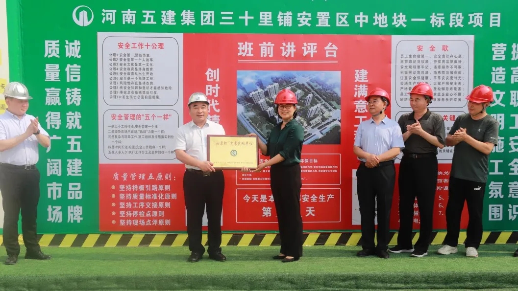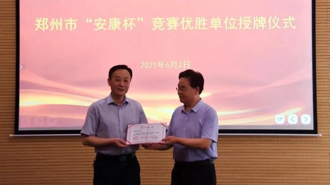 6月2日下午,鄭州市總工會(huì)機(jī)關(guān)工會(huì)主任王銀倉、市總工會(huì)勞動(dòng)和經(jīng)濟(jì)部部長(zhǎng)宋慧分別向集團(tuán)兩家獲獎(jiǎng)公司頒發(fā)鄭州市“安康杯”競(jìng)賽優(yōu)勝單位獎(jiǎng)牌。